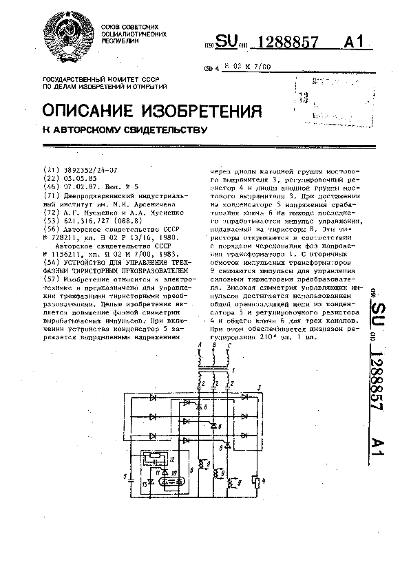Устройство для управления трехфазным тиристорным преобразователем / Мусиенко А. Г., Мусиенко А. А.; заявитель: Днепродзержинский индустриальный институт им. М. И. Арсеничева // Описания изобретений (ретрофонд) / Комитет по патентам и товарным знакам России. – М., 2003. – 1987, № 1. — (Патенты России). — Загл. с титул. экрана. — Систем. требования: Acrobat Reader. — Режим доступа: ftp://smolensklib.ru/bd/patent_ru/pt1288857.pdf. — <URL:ftp://smolensklib.ru/bd/patent_ru/pt1288857.pdf>.