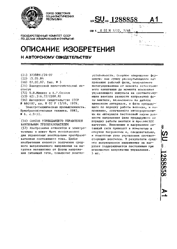 Способ упреждающего управления вентильным преобразователем / Михеев Н. Н., Околов А. Р.; заявитель: Белорусский политехнический институт // Описания изобретений (ретрофонд) / Комитет по патентам и товарным знакам России. – М., 2003. – 1987, № 1. — (Патенты России). — Загл. с титул. экрана. — Систем. требования: Acrobat Reader. — Режим доступа: ftp://smolensklib.ru/bd/patent_ru/pt1288858.pdf. — <URL:ftp://smolensklib.ru/bd/patent_ru/pt1288858.pdf>.
