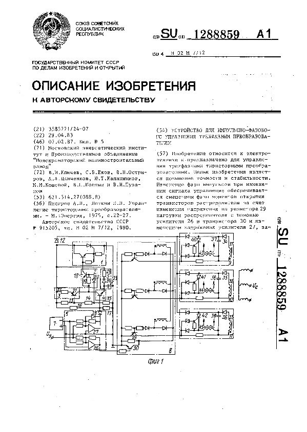 Устройство для импульсно-фазового управления трехфазным преобразователем / Ключев В. И., Ежов С. В., Остриров В. Н. [и др.]; заявитель: Московский энергетический институт, Производственное объединение "Новокраматорский машиностроительный завод" // Описания изобретений (ретрофонд) / Комитет по патентам и товарным знакам России. – М., 2003. – 1987, № 1. — (Патенты России). — Загл. с титул. экрана. — Систем. требования: Acrobat Reader. — Режим доступа: ftp://smolensklib.ru/bd/patent_ru/pt1288859.pdf. — <URL:ftp://smolensklib.ru/bd/patent_ru/pt1288859.pdf>.