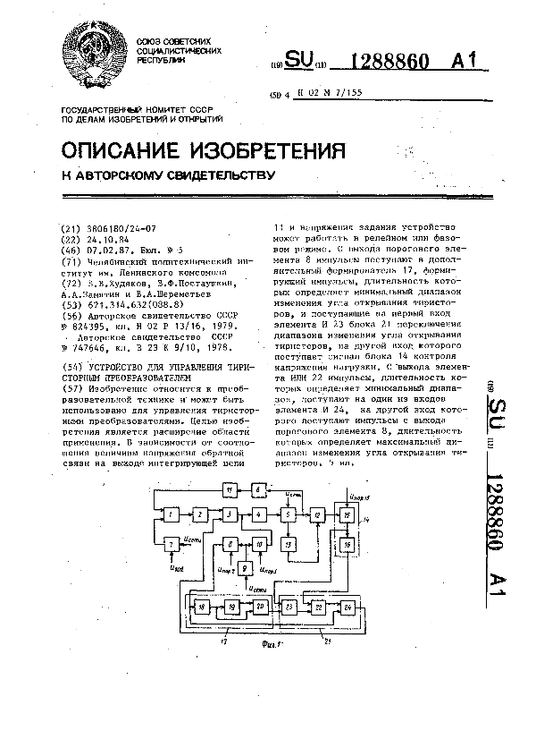 Устройство для управления тиристорным преобразователем / Худяков Б. В., Постаушкин В. Ф., Замятин А. А., Шереметьев В. А.; заявитель: Челябинский политехнический институт им. Ленинского комсомола // Описания изобретений (ретрофонд) / Комитет по патентам и товарным знакам России. – М., 2003. – 1987, № 1. — (Патенты России). — Загл. с титул. экрана. — Систем. требования: Acrobat Reader. — Режим доступа: ftp://smolensklib.ru/bd/patent_ru/pt1288860.pdf. — <URL:ftp://smolensklib.ru/bd/patent_ru/pt1288860.pdf>.