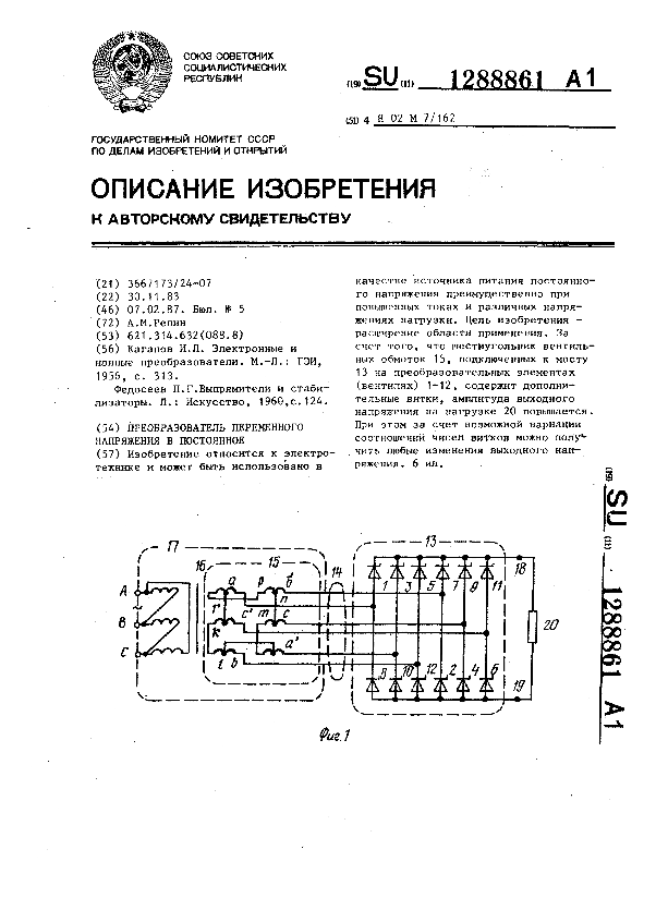 Преобразователь переменного напряжения в постоянное / Репин А. М. // Описания изобретений (ретрофонд) / Комитет по патентам и товарным знакам России. – М., 2003. – 1987, № 1. — (Патенты России). — Загл. с титул. экрана. — Систем. требования: Acrobat Reader. — Режим доступа: ftp://smolensklib.ru/bd/patent_ru/pt1288861.pdf. — <URL:ftp://smolensklib.ru/bd/patent_ru/pt1288861.pdf>.
