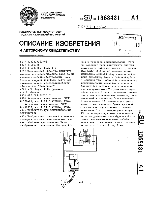 Устройство для ориентирования отклонителя / Бару А. И., Гринченко Н. Н., Оленич А. Н.; заявитель: Специальное проектно-конструкторское и технологическое бюро по погружному электрооборудованию для бурения скважин и добычи нефти Всесоюзного научно-производственного объединения "Потенциал" // Описания изобретений (ретрофонд) / Комитет по патентам и товарным знакам России. — М., 1994-____. — (Патенты России). – 1988, № 1. — Загл. с титул. экрана. — Поисковая система: ИПС MIMOSA GTI. — Систем. требования: Acrobat Reader. — Режим доступа: ftp://smolensklib.ru/bd/patent_ru/pt1368431.pdf. — <URL:ftp://smolensklib.ru/bd/patent_ru/pt1368431.pdf>.
