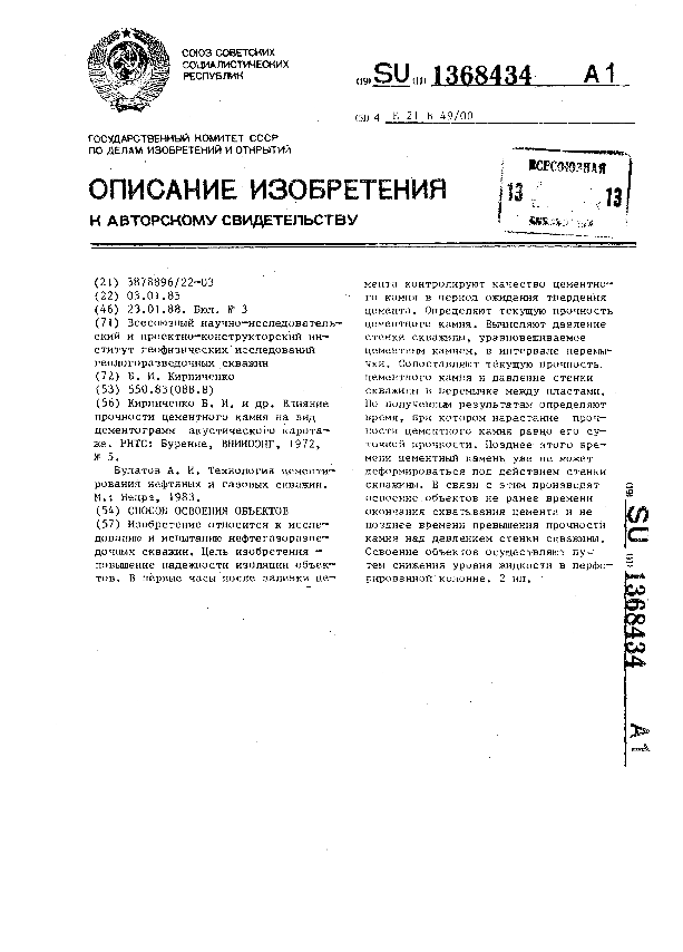 Способ освоения объектов / Кирпиченко Б. И.; заявитель: Всесоюзный научно-исследовательский и проектно-конструкторский институт геофизических исследований геологоразведочных скважин // Описания изобретений (ретрофонд) / Комитет по патентам и товарным знакам России. — М., 1994-____. — (Патенты России). – 1988, № 1. — Загл. с титул. экрана. — Поисковая система: ИПС MIMOSA GTI. — Систем. требования: Acrobat Reader. — Режим доступа: ftp://smolensklib.ru/bd/patent_ru/pt1368434.pdf. — <URL:ftp://smolensklib.ru/bd/patent_ru/pt1368434.pdf>.