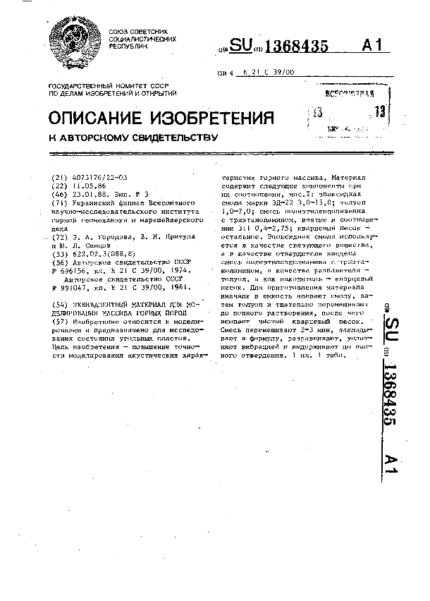 Эквивалентный материал для моделирования массива горных пород / Городова Э. А., Притула В. И., Семцов Ю. Л.; заявитель: Украинский филиал Всесоюзного научно-исследовательского института горной геомеханики и маркшейдерского дела // Описания изобретений (ретрофонд) / Комитет по патентам и товарным знакам России. — М., 1994-____. — (Патенты России). – 1988, № 1. — Загл. с титул. экрана. — Поисковая система: ИПС MIMOSA GTI. — Систем. требования: Acrobat Reader. — Режим доступа: ftp://smolensklib.ru/bd/patent_ru/pt1368435.pdf. — <URL:ftp://smolensklib.ru/bd/patent_ru/pt1368435.pdf>.