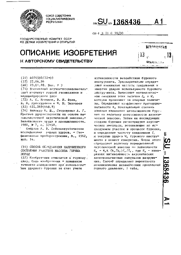 Способ определения напряженного состояния участков массива горных пород / Бляхман А. С., Фрид В. И., Проскуряков В. М., Зиновьев Ю. М.; заявитель: Всесоюзный научно-исследовательский институт горной геомеханики и маркшейдерского дела // Описания изобретений (ретрофонд) / Комитет по патентам и товарным знакам России. — М., 1994-____. — (Патенты России). – 1988, № 1. — Загл. с титул. экрана. — Поисковая система: ИПС MIMOSA GTI. — Систем. требования: Acrobat Reader. — Режим доступа: ftp://smolensklib.ru/bd/patent_ru/pt1368436.pdf. — <URL:ftp://smolensklib.ru/bd/patent_ru/pt1368436.pdf>.