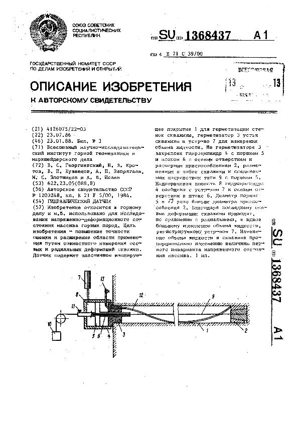 Гидравлический датчик / Георгиевский В. С., Кротов Н. В., Кузнецов В. П. [и др.]; заявитель: Всесоюзный научно-исследовательский институт горной геомеханики и маркшейдерского дела // Описания изобретений (ретрофонд) / Комитет по патентам и товарным знакам России. — М., 1994-____. — (Патенты России). – 1988, № 1. — Загл. с титул. экрана. — Поисковая система: ИПС MIMOSA GTI. — Систем. требования: Acrobat Reader. — Режим доступа: ftp://smolensklib.ru/bd/patent_ru/pt1368437.pdf. — <URL:ftp://smolensklib.ru/bd/patent_ru/pt1368437.pdf>.