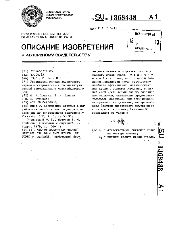Способ защиты сопряжений шахтных стволов с выработками от горного давления / Южанин И. А., Дрибан В. А., Кулибаба С. Б.; заявитель: Украинский филиал Всесоюзного научно-исследовательского института горной геомеханики и маркшейдерского дела // Описания изобретений (ретрофонд) / Комитет по патентам и товарным знакам России. — М., 1994-____. — (Патенты России). – 1988, № 1. — Загл. с титул. экрана. — Поисковая система: ИПС MIMOSA GTI. — Систем. требования: Acrobat Reader. — Режим доступа: ftp://smolensklib.ru/bd/patent_ru/pt1368438.pdf. — <URL:ftp://smolensklib.ru/bd/patent_ru/pt1368438.pdf>.
