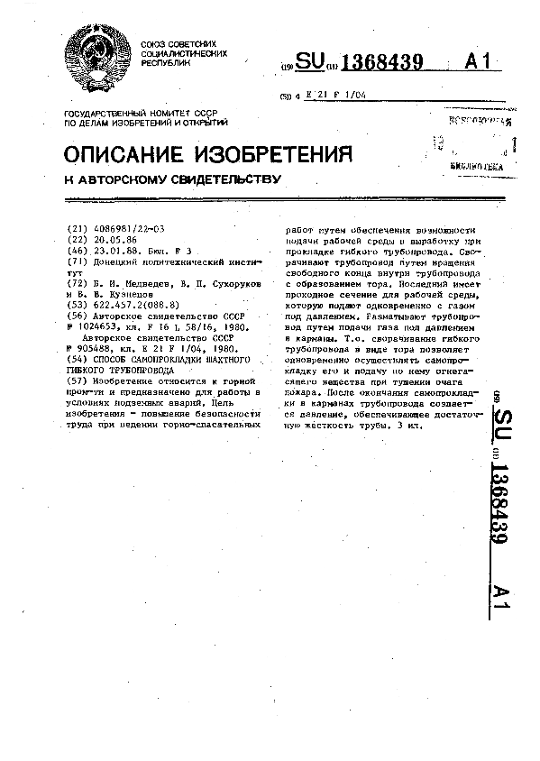 Способ самопрокладки шахтного гибкого трубопровода / Медведев Б. И., Сухоруков В. П., Кузнецов В. В.; заявитель: Донецкий политехнический институт // Описания изобретений (ретрофонд) / Комитет по патентам и товарным знакам России. — М., 1994-____. — (Патенты России). – 1988, № 1. — Загл. с титул. экрана. — Поисковая система: ИПС MIMOSA GTI. — Систем. требования: Acrobat Reader. — Режим доступа: ftp://smolensklib.ru/bd/patent_ru/pt1368439.pdf. — <URL:ftp://smolensklib.ru/bd/patent_ru/pt1368439.pdf>.
