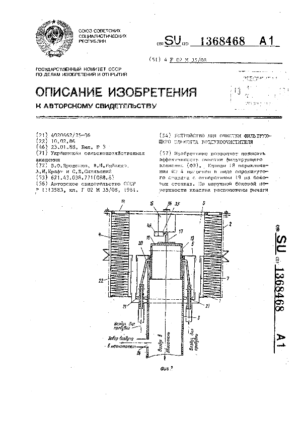 Устройство для очистки фильтрующего элемента воздухоочистителя / Ярошенко В. Ф., Рыбалко В. Н., Крафт А. И., Синявский С. В.; заявитель: Украинская сельскохозяйственная академия // Описания изобретений (ретрофонд) / Комитет по патентам и товарным знакам России. — М., 1994-____. — (Патенты России). – 1988, № 1. — Загл. с титул. экрана. — Поисковая система: ИПС MIMOSA GTI. — Систем. требования: Acrobat Reader. — Режим доступа: ftp://smolensklib.ru/bd/patent_ru/pt1368468.pdf. — <URL:ftp://smolensklib.ru/bd/patent_ru/pt1368468.pdf>.
