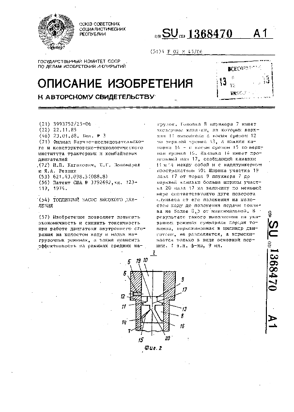 Топливный насос высокого давления / Каганович И. Л., Пономарев Е. Г., Резник Я. А.; заявитель: Филиал Научно-исследовательского и конструкторско-технологического института тракторных и комбайновых двигателей // Описания изобретений (ретрофонд) / Комитет по патентам и товарным знакам России. — М., 1994-____. — (Патенты России). – 1988, № 1. — Загл. с титул. экрана. — Поисковая система: ИПС MIMOSA GTI. — Систем. требования: Acrobat Reader. — Режим доступа: ftp://smolensklib.ru/bd/patent_ru/pt1368470.pdf. — <URL:ftp://smolensklib.ru/bd/patent_ru/pt1368470.pdf>.
