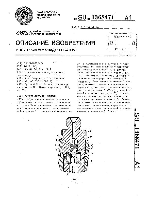 Нагнетательный клапан / Смирнов Б. А., Смирнов Д. М.; заявитель: Ярославский завод топливной аппаратуры // Описания изобретений (ретрофонд) / Комитет по патентам и товарным знакам России. — М., 1994-____. — (Патенты России). – 1988, № 1. — Загл. с титул. экрана. — Поисковая система: ИПС MIMOSA GTI. — Систем. требования: Acrobat Reader. — Режим доступа: ftp://smolensklib.ru/bd/patent_ru/pt1368471.pdf. — <URL:ftp://smolensklib.ru/bd/patent_ru/pt1368471.pdf>.