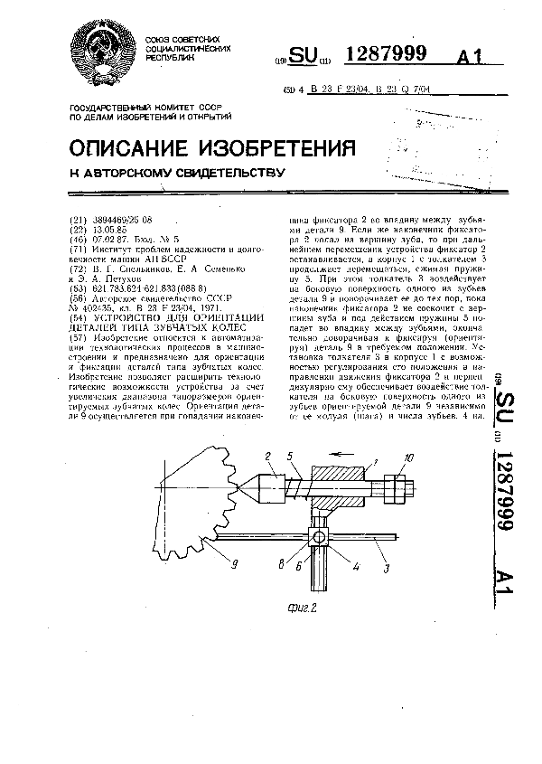 Устройство для ориентации деталей типа зубчатых колес / Спельников В. Г., Семенько Е. А., Петухов Э. А.; заявитель: Институт проблем надежности и долговечности машин АН БССР // Описания изобретений (ретрофонд) / Комитет по патентам и товарным знакам России. – М., 2003. – 1987, № 1. — (Патенты России). — Загл. с титул. экрана. — Поисковая система: MIMOSA GTI. — Систем. требования: Acrobat Reader. — Режим доступа: ftp://smolensklib.ru/bd/patent_ru/pt1287999.pdf. — <URL:ftp://smolensklib.ru/bd/patent_ru/pt1287999.pdf>.