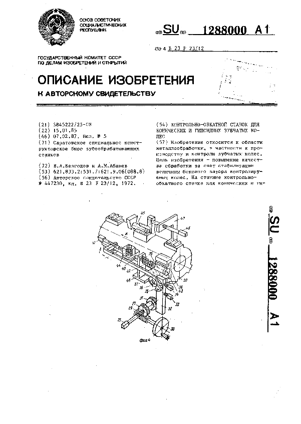 Контрольно-обкатной станок для конических и гипоидных зубчатых колес / Безгодов В. А., Абашев А. М.; заявитель: Саратовское специальное конструкторское бюро зубообрабатывающих станков // Описания изобретений (ретрофонд) / Комитет по патентам и товарным знакам России. – М., 2003. – 1987, № 1. — (Патенты России). — Загл. с титул. экрана. — Поисковая система: MIMOSA GTI. — Систем. требования: Acrobat Reader. — Режим доступа: ftp://smolensklib.ru/bd/patent_ru/pt1288000.pdf. — <URL:ftp://smolensklib.ru/bd/patent_ru/pt1288000.pdf>.