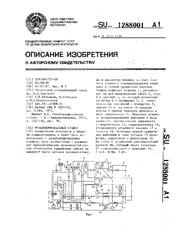 Резьбошлифовальный станок / Петраков Г. Н., Маслов В. П., Перепеченков Ю. А.; заявитель: Московский автомобильный завод им. И. А. Лихачева // Описания изобретений (ретрофонд) / Комитет по патентам и товарным знакам России. – М., 2003. – 1987, № 1. — (Патенты России). — Загл. с титул. экрана. — Поисковая система: MIMOSA GTI. — Систем. требования: Acrobat Reader. — Режим доступа: ftp://smolensklib.ru/bd/patent_ru/pt1288001.pdf. — <URL:ftp://smolensklib.ru/bd/patent_ru/pt1288001.pdf>.