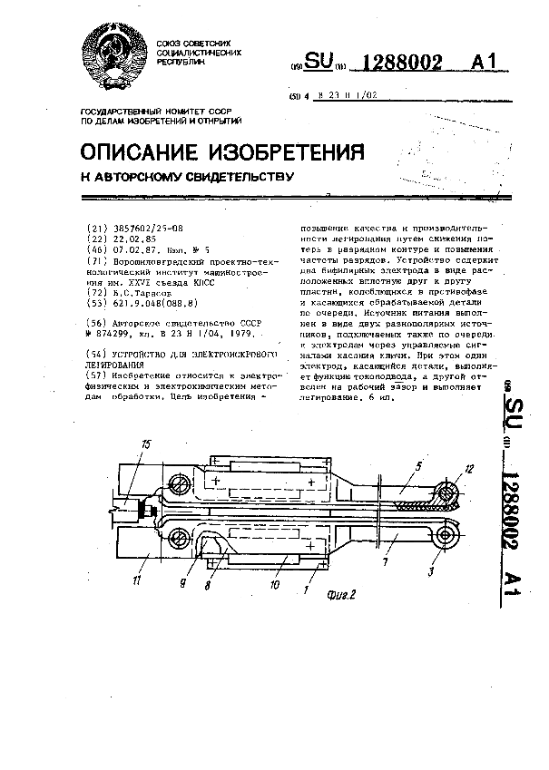 Устройство для электроискрового легирования / Тарасов В. С.; заявитель: Ворошиловградский проектно-технологический институт машиностроения им. XXVI съезда КПСС // Описания изобретений (ретрофонд) / Комитет по патентам и товарным знакам России. – М., 2003. – 1987, № 1. — (Патенты России). — Загл. с титул. экрана. — Поисковая система: MIMOSA GTI. — Систем. требования: Acrobat Reader. — Режим доступа: ftp://smolensklib.ru/bd/patent_ru/pt1288002.pdf. — <URL:ftp://smolensklib.ru/bd/patent_ru/pt1288002.pdf>.