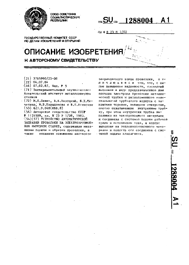 Устройство автоматической заправки проволоки на электроэрозионном вырезном станке / Левит М. Л., Полоцкий В. Е., Мечетнер Б. Х. [и др.]; заявитель: Экспериментальный научно-исследовательский институт металлорежущих станков // Описания изобретений (ретрофонд) / Комитет по патентам и товарным знакам России. – М., 2003. – 1987, № 1. — (Патенты России). — Загл. с титул. экрана. — Поисковая система: MIMOSA GTI. — Систем. требования: Acrobat Reader. — Режим доступа: ftp://smolensklib.ru/bd/patent_ru/pt1288004.pdf. — <URL:ftp://smolensklib.ru/bd/patent_ru/pt1288004.pdf>.