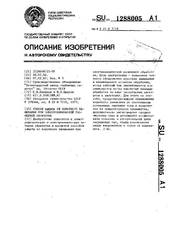 Способ защиты от короткого замыкания при электрохимической размерной обработке / Немилов Е. Ф., Цыркин М. З.; заявитель: Производственное объединение "Ленинградский завод турбинных лопаток" им. 50-летия СССР // Описания изобретений (ретрофонд) / Комитет по патентам и товарным знакам России. – М., 2003. – 1987, № 1. — (Патенты России). — Загл. с титул. экрана. — Поисковая система: MIMOSA GTI. — Систем. требования: Acrobat Reader. — Режим доступа: ftp://smolensklib.ru/bd/patent_ru/pt1288005.pdf. — <URL:ftp://smolensklib.ru/bd/patent_ru/pt1288005.pdf>.