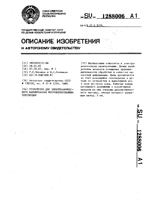 Устройство для электрохимического маркирования непрофилированным электродом / Чеканов Г. С., Ратников В. С. // Описания изобретений (ретрофонд) / Комитет по патентам и товарным знакам России. – М., 2003. – 1987, № 1. — (Патенты России). — Загл. с титул. экрана. — Поисковая система: MIMOSA GTI. — Систем. требования: Acrobat Reader. — Режим доступа: ftp://smolensklib.ru/bd/patent_ru/pt1288006.pdf. — <URL:ftp://smolensklib.ru/bd/patent_ru/pt1288006.pdf>.
