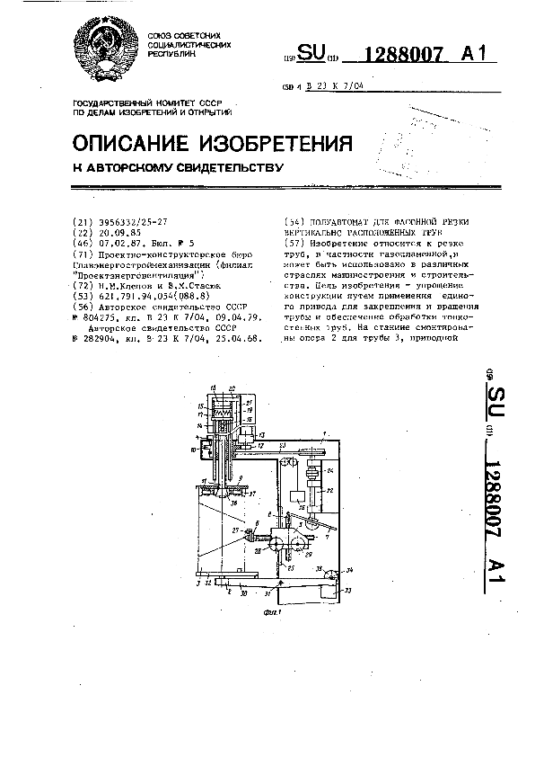 Полуавтомат для фасонной резки вертикально расположенных труб / Клепов Н. М., Стасюк В. М.; заявитель: Проектно-конструкторское бюро Главэнергостроймеханизации (филиал "Проектэнерговентиляция") // Описания изобретений (ретрофонд) / Комитет по патентам и товарным знакам России. – М., 2003. – 1987, № 1. — (Патенты России). — Загл. с титул. экрана. — Поисковая система: MIMOSA GTI. — Систем. требования: Acrobat Reader. — Режим доступа: ftp://smolensklib.ru/bd/patent_ru/pt1288007.pdf. — <URL:ftp://smolensklib.ru/bd/patent_ru/pt1288007.pdf>.