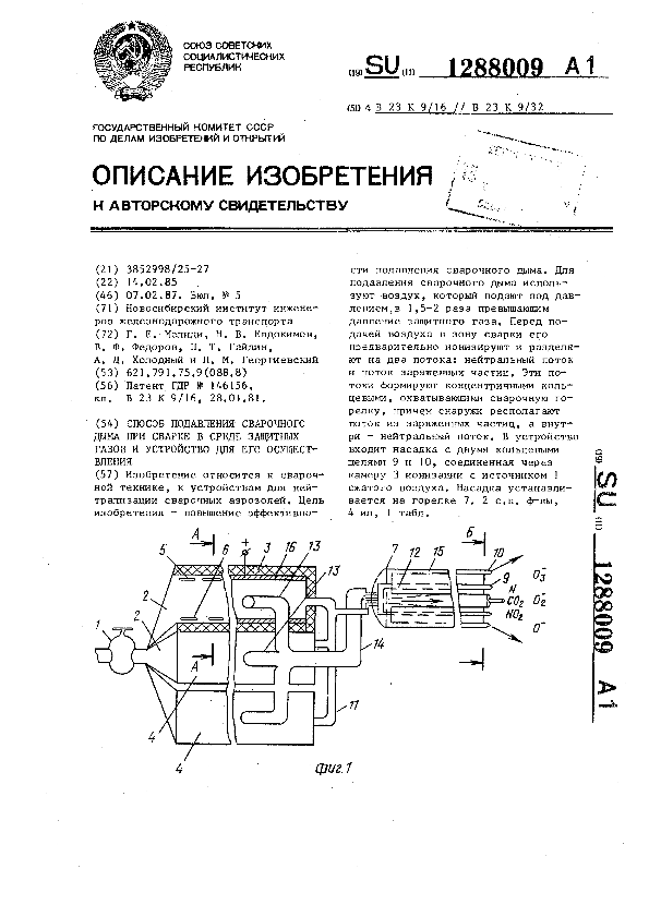 Способ подавления сварочного дыма при сварке в среде защитных газов и устройство для его осуществления / Мелиди Г. Е., Евдокимов Н. В., Федоров В. Ф. [и др.]; заявитель: Новосибирский институт инженеров железнодорожного транспорта // Описания изобретений (ретрофонд) / Комитет по патентам и товарным знакам России. – М., 2003. – 1987, № 1. — (Патенты России). — Загл. с титул. экрана. — Поисковая система: MIMOSA GTI. — Систем. требования: Acrobat Reader. — Режим доступа: ftp://smolensklib.ru/bd/patent_ru/pt1288009.pdf. — <URL:ftp://smolensklib.ru/bd/patent_ru/pt1288009.pdf>.