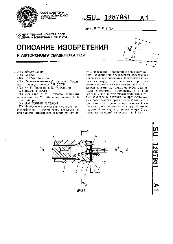 Цанговый патрон / Баженов Ю. Г., Климов В. Ф.; заявитель: Физико-технический институт Уральского научного центра АН СССР // Описания изобретений (ретрофонд) / Комитет по патентам и товарным знакам России. – М., 2003. – 1987, № 1. — (Патенты России). — Загл. с титул. экрана. — Поисковая система: MIMOSA GTI. — Систем. требования: Acrobat Reader. — Режим доступа: ftp://smolensklib.ru/bd/patent_ru/pt1287981.pdf. — <URL:ftp://smolensklib.ru/bd/patent_ru/pt1287981.pdf>.