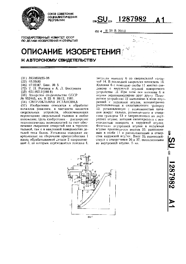 Сверлильная установка / Роговец Т. П., Востриков А. Л. // Описания изобретений (ретрофонд) / Комитет по патентам и товарным знакам России. – М., 2003. – 1987, № 1. — (Патенты России). — Загл. с титул. экрана. — Поисковая система: MIMOSA GTI. — Систем. требования: Acrobat Reader. — Режим доступа: ftp://smolensklib.ru/bd/patent_ru/pt1287982.pdf. — <URL:ftp://smolensklib.ru/bd/patent_ru/pt1287982.pdf>.