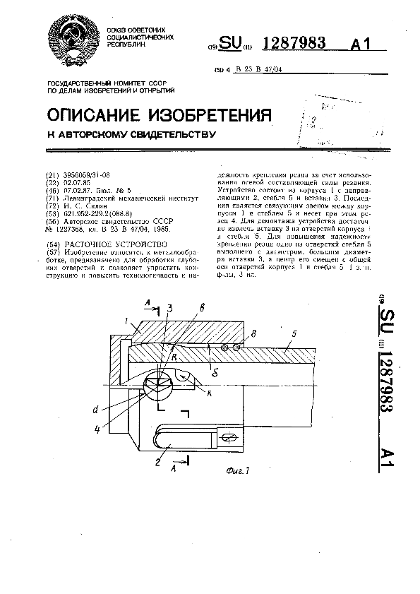 Расточное устройство / Силин Н. С.; заявитель: Ленинградский механический институт // Описания изобретений (ретрофонд) / Комитет по патентам и товарным знакам России. – М., 2003. – 1987, № 1. — (Патенты России). — Загл. с титул. экрана. — Поисковая система: MIMOSA GTI. — Систем. требования: Acrobat Reader. — Режим доступа: ftp://smolensklib.ru/bd/patent_ru/pt1287983.pdf. — <URL:ftp://smolensklib.ru/bd/patent_ru/pt1287983.pdf>.