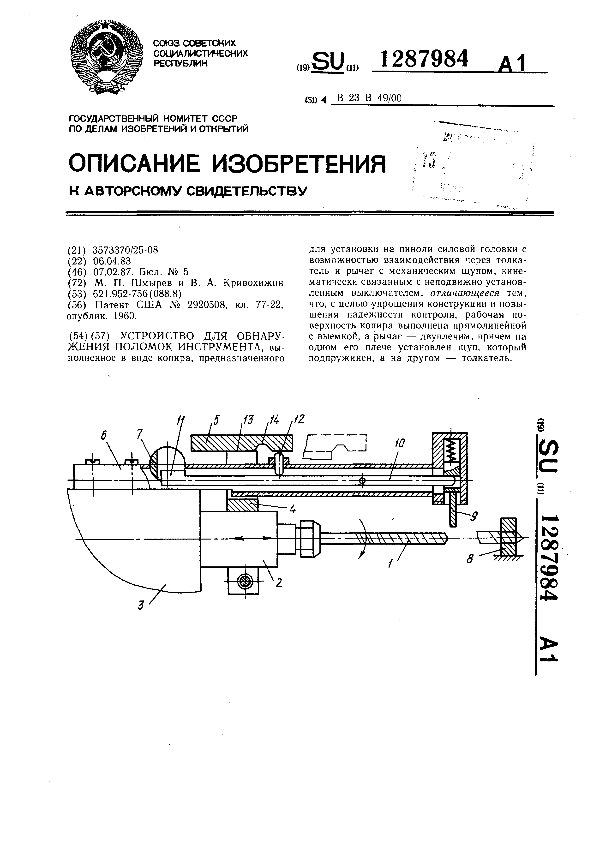 Устройство для обнаружения поломок инструмента / Шмырев М. П., Кривохижин В. А. // Описания изобретений (ретрофонд) / Комитет по патентам и товарным знакам России. – М., 2003. – 1987, № 1. — (Патенты России). — Загл. с титул. экрана. — Поисковая система: MIMOSA GTI. — Систем. требования: Acrobat Reader. — Режим доступа: ftp://smolensklib.ru/bd/patent_ru/pt1287984.pdf. — <URL:ftp://smolensklib.ru/bd/patent_ru/pt1287984.pdf>.