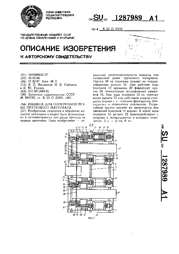 Машина для поперечной резки пруткового материала / Филиппов В. П., Рыбаков И. В., Уханов В. Ю. // Описания изобретений (ретрофонд) / Комитет по патентам и товарным знакам России. – М., 2003. – 1987, № 1. — (Патенты России). — Загл. с титул. экрана. — Поисковая система: MIMOSA GTI. — Систем. требования: Acrobat Reader. — Режим доступа: ftp://smolensklib.ru/bd/patent_ru/pt1287989.pdf. — <URL:ftp://smolensklib.ru/bd/patent_ru/pt1287989.pdf>.