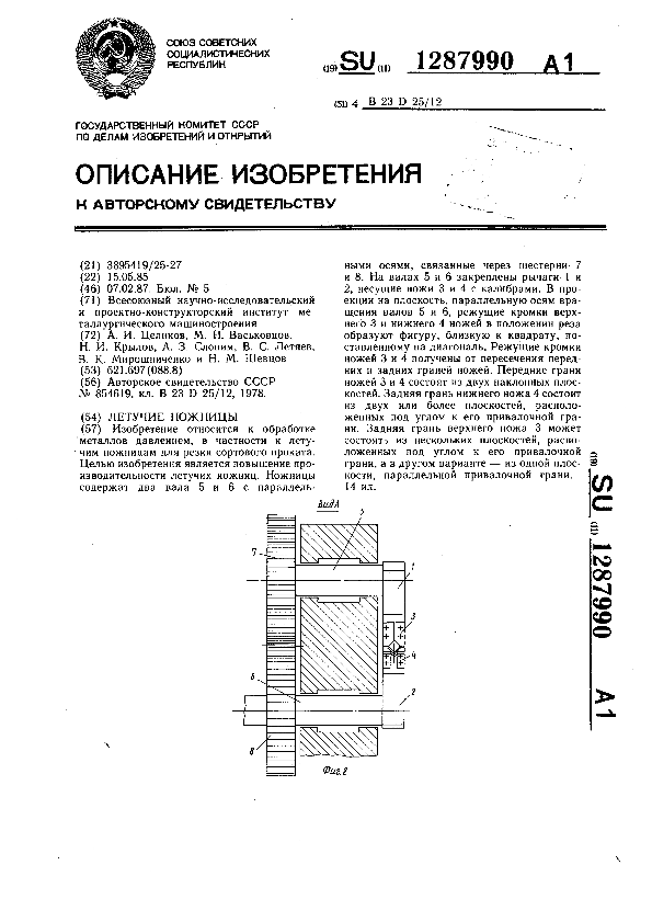 Летучие ножницы / Целиков А. И., Васьковцов М. Н., Крылов Н. И. [и др.]; заявитель: Всесоюзный научно-исследовательский и проектно-конструкторский институт металлургического машиностроения // Описания изобретений (ретрофонд) / Комитет по патентам и товарным знакам России. – М., 2003. – 1987, № 1. — (Патенты России). — Загл. с титул. экрана. — Поисковая система: MIMOSA GTI. — Систем. требования: Acrobat Reader. — Режим доступа: ftp://smolensklib.ru/bd/patent_ru/pt1287990.pdf. — <URL:ftp://smolensklib.ru/bd/patent_ru/pt1287990.pdf>.