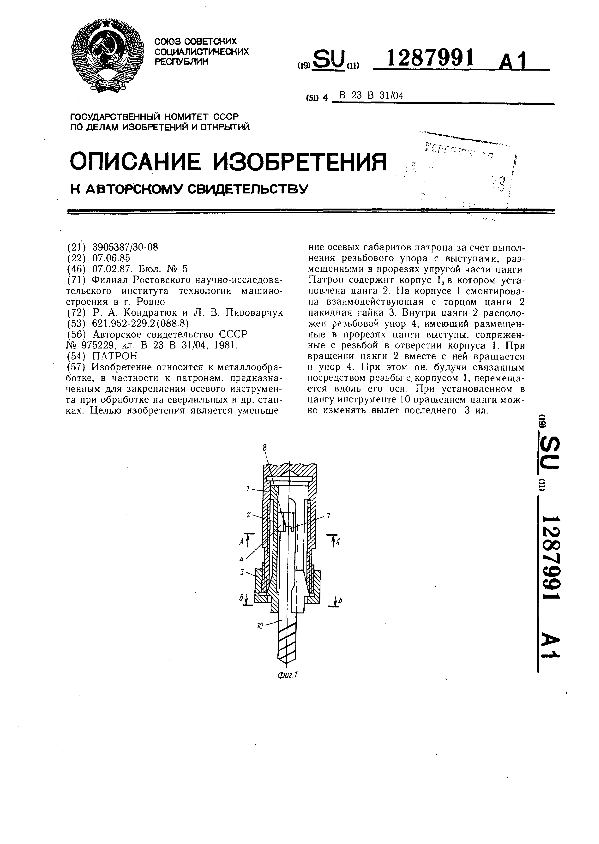 Патрон / Кондратюк Р. А., Пивоварчук Л. В.; заявитель: Филиал Ростовского научно-исследовательского института технологии машиностроения в г. Ровно // Описания изобретений (ретрофонд) / Комитет по патентам и товарным знакам России. – М., 2003. – 1987, № 1. — (Патенты России). — Загл. с титул. экрана. — Поисковая система: MIMOSA GTI. — Систем. требования: Acrobat Reader. — Режим доступа: ftp://smolensklib.ru/bd/patent_ru/pt1287991.pdf. — <URL:ftp://smolensklib.ru/bd/patent_ru/pt1287991.pdf>.