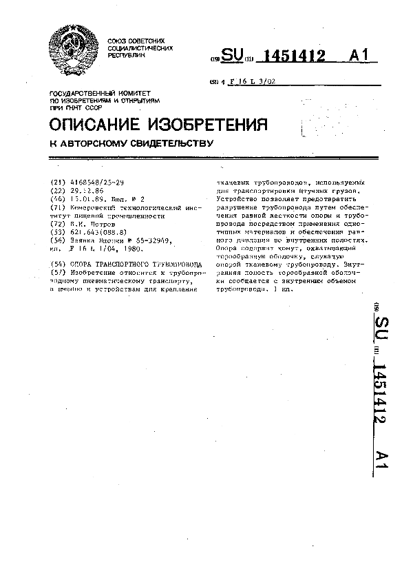 Опора транспортного трубопровода / Петров В. И.; заявитель: Кемеровский технологический институт пищевой промышленности // Описания изобретений (ретрофонд) / Комитет по патентам и товарным знакам России. – М., 2003. – 1989, № 1. — (Патенты России). — Загл. с титул. экрана. — Поисковая система: ИПС MIMOSA GTI. — Систем. требования: Acrobat Reader. — Режим доступа: ftp://smolensklib.ru/bd/patent_ru/pt1451412.pdf. — <URL:ftp://smolensklib.ru/bd/patent_ru/pt1451412.pdf>.