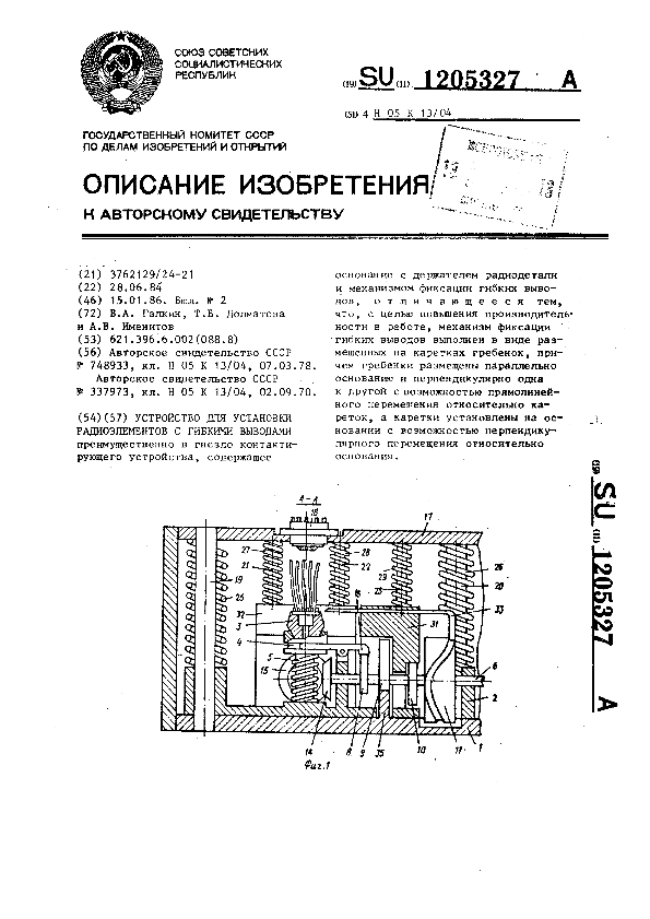 Устройство для установки радиоэлементов с гибкими выводами / Галкин В. А., Долматова Т. В., Именитов А. В. // Описания изобретений (ретрофонд) / Комитет по патентам и товарным знакам России. – М., 2003. – 1986, № 1. — (Патенты России). — Загл. с титул. экрана. — Поисковая система: ИПС MIMOSA GTI. — Систем. требования: Acrobat Reader. — Режим доступа: ftp://smolensklib.ru/bd/patent_ru/pt1205327.pdf. — <URL:ftp://smolensklib.ru/bd/patent_ru/pt1205327.pdf>.