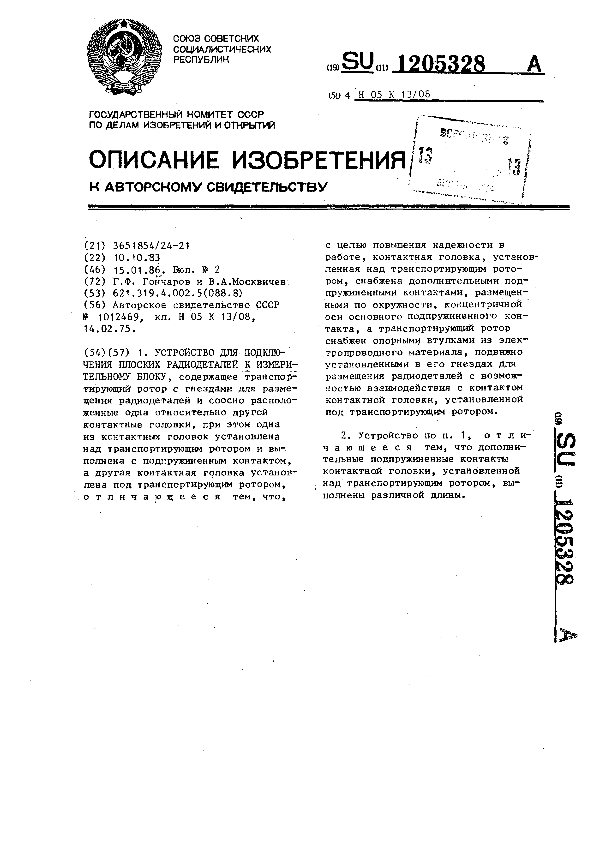 Устройство для подключения плоских радиодеталей к измерительному блоку / Гончаров Г. Ф., Москвичев В. А. // Описания изобретений (ретрофонд) / Комитет по патентам и товарным знакам России. – М., 2003. – 1986, № 1. — (Патенты России). — Загл. с титул. экрана. — Поисковая система: ИПС MIMOSA GTI. — Систем. требования: Acrobat Reader. — Режим доступа: ftp://smolensklib.ru/bd/patent_ru/pt1205328.pdf. — <URL:ftp://smolensklib.ru/bd/patent_ru/pt1205328.pdf>.