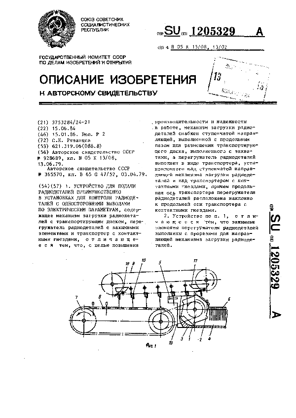 Устройство для подачи радиодеталей,преимущественно,в установках для контроля радиодеталей с односторонними выводами по электрическим параметрам / Рязанцев С. Н. // Описания изобретений (ретрофонд) / Комитет по патентам и товарным знакам России. – М., 2003. – 1986, № 1. — (Патенты России). — Загл. с титул. экрана. — Поисковая система: ИПС MIMOSA GTI. — Систем. требования: Acrobat Reader. — Режим доступа: ftp://smolensklib.ru/bd/patent_ru/pt1205329.pdf. — <URL:ftp://smolensklib.ru/bd/patent_ru/pt1205329.pdf>.