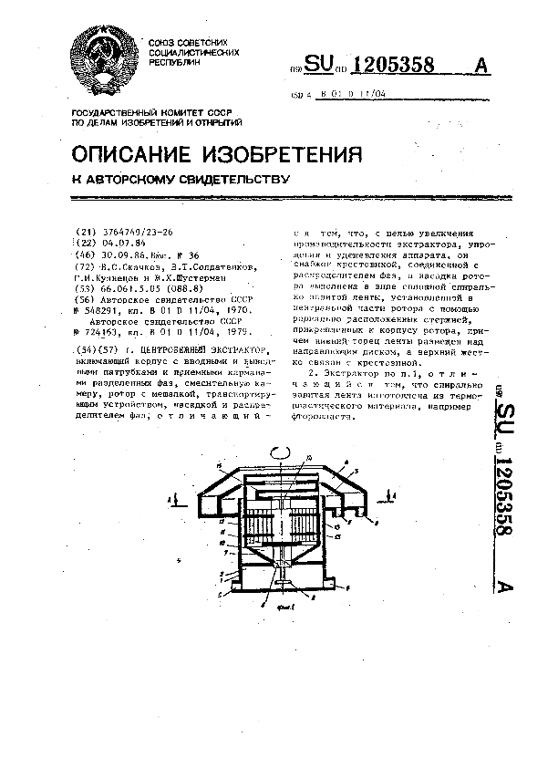 Центробежный экстрактор / Скачков В. С., Солдатенков В. Т., Кузнецов Г. И. [и др.] // Описания изобретений (ретрофонд) / Комитет по патентам и товарным знакам России. – М., 2003. – 1986, № 1. — (Патенты России). — Загл. с титул. экрана. — Поисковая система: ИПС MIMOSA GTI. — Систем. требования: Acrobat Reader. — Режим доступа: ftp://smolensklib.ru/bd/patent_ru/pt1205358.pdf. — <URL:ftp://smolensklib.ru/bd/patent_ru/pt1205358.pdf>.