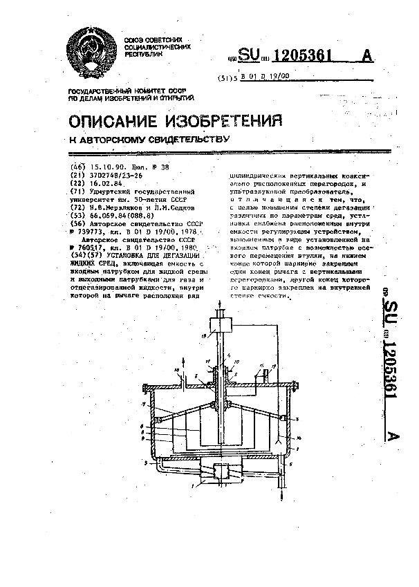 Установка для дегазации жидких сред / Мерзляков Н. В., Седлов Л. М.; заявитель: Удмуртский государственный университет им. 50-летия СССР // Описания изобретений (ретрофонд) / Комитет по патентам и товарным знакам России. – М., 2003. – 1986, № 1. — (Патенты России). — Загл. с титул. экрана. — Поисковая система: ИПС MIMOSA GTI. — Систем. требования: Acrobat Reader. — Режим доступа: ftp://smolensklib.ru/bd/patent_ru/pt1205361.pdf. — <URL:ftp://smolensklib.ru/bd/patent_ru/pt1205361.pdf>.