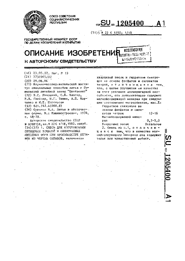 Смесь для изготовления облицовок кокилей и оболочковых литейных форм при производстве отливок из черных сплавов / Линецкий Б. С., Кантор С. Б., Глейзер Р. Л. [и др.]; заявитель: Научно-исследовательский институт специальных способов литья, Гомельский литейный завод "Центролит" // Описания изобретений (ретрофонд) / Комитет по патентам и товарным знакам России. – М., 2003. – 1986, № 1. — (Патенты России). — Загл. с титул. экрана. — Поисковая система: ИПС MIMOSA GTI. — Систем. требования: Acrobat Reader. — Режим доступа: ftp://smolensklib.ru/bd/patent_ru/pt1205400.pdf. — <URL:ftp://smolensklib.ru/bd/patent_ru/pt1205400.pdf>.