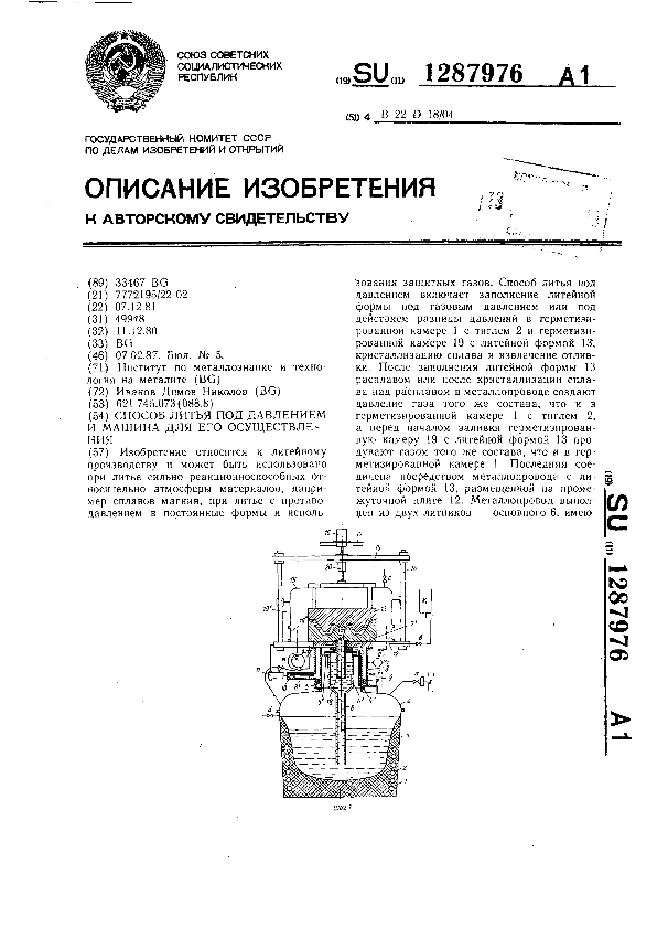Способ литья под давлением и машина для его осуществления / Николов И. Д.; заявитель: Институт по металлознание и технология на металите // Описания изобретений (ретрофонд) / Комитет по патентам и товарным знакам России. – М., 2003. – 1987, № 1. — (Патенты России). — Загл. с титул. экрана. — Поисковая система: MIMOSA GTI. — Систем. требования: Acrobat Reader. — Режим доступа: ftp://smolensklib.ru/bd/patent_ru/pt1287976.pdf. — <URL:ftp://smolensklib.ru/bd/patent_ru/pt1287976.pdf>.