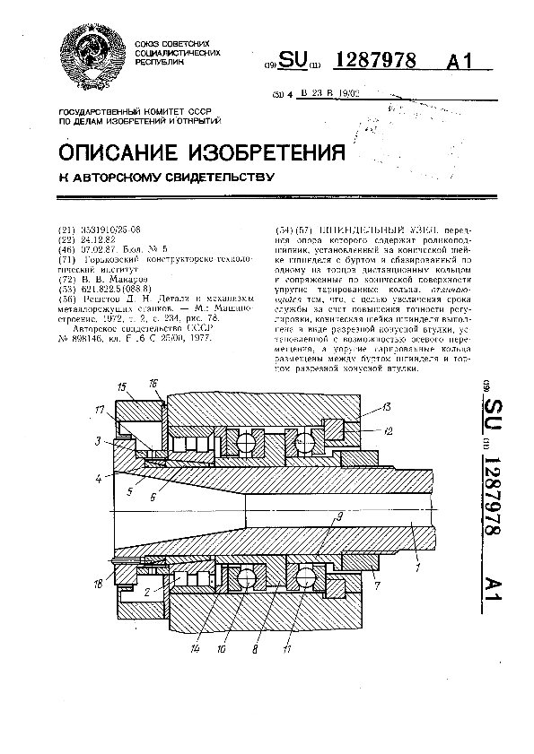 Шпиндельный узел / Макаров В. В.; заявитель: Горьковский конструкторско-технологический институт // Описания изобретений (ретрофонд) / Комитет по патентам и товарным знакам России. – М., 2003. – 1987, № 1. — (Патенты России). — Загл. с титул. экрана. — Поисковая система: MIMOSA GTI. — Систем. требования: Acrobat Reader. — Режим доступа: ftp://smolensklib.ru/bd/patent_ru/pt1287978.pdf. — <URL:ftp://smolensklib.ru/bd/patent_ru/pt1287978.pdf>.