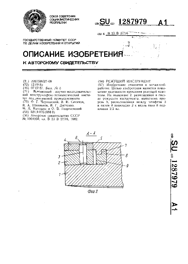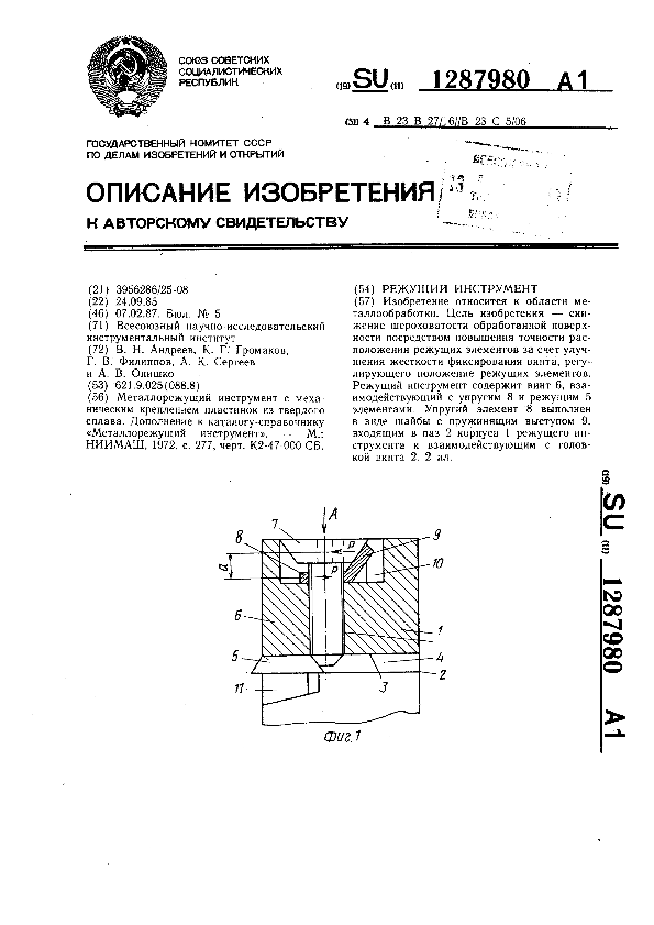 Режущий инструмент / Андреев В. Н., Громаков К. Г., Филиппов Г. В. [и др.]; заявитель: Всесоюзный научно-исследовательский инструментальный институт // Описания изобретений (ретрофонд) / Комитет по патентам и товарным знакам России. – М., 2003. – 1987, № 1. — (Патенты России). — Загл. с титул. экрана. — Поисковая система: MIMOSA GTI. — Систем. требования: Acrobat Reader. — Режим доступа: ftp://smolensklib.ru/bd/patent_ru/pt1287980.pdf. — <URL:ftp://smolensklib.ru/bd/patent_ru/pt1287980.pdf>.