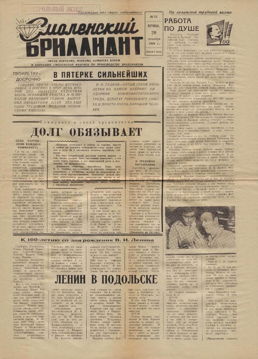 Смоленский бриллиант: Орган парткома, фабкома, комитета ВЛКСМ и дирекции Смоленской фабрики по производству бриллиантов. — Смоленск: Смолгортип., 1968-____. № 52.