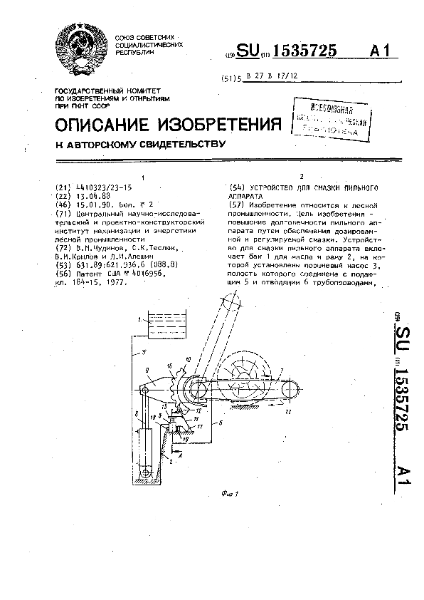 Устройство для смазки пильного аппарата / Теслюк С. К., Крылов В. М., Чудинов В. М., Алешин Д. И.; заявитель: Центральный научно-исследовательский и проектно-конструкторский институт механизации и энергетики лесной промышленности // Описания изобретений (ретрофонд) / Комитет по патентам и товарным знакам России. – М., 2003. – 1990, № 1. — (Патенты России). — Загл. с титул. экрана. — Поисковая система: MIMOSA GTI. — Систем. требования: Acrobat Reader. — Режим доступа: ftp://smolensklib.ru/bd/patent_ru/pt1535725.pdf. — <URL:ftp://smolensklib.ru/bd/patent_ru/pt1535725.pdf>.
