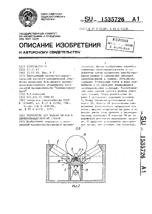 Устройство для подачи бревен в деревообрабатывающий станок / Рыбицкий П. Н.; заявитель: Центральный научно-исследовательский институт механической обработки древесины Всесоюзного научно-производственного объединения лесопильной промышленности "Союзнаучдревпром" // Описания изобретений (ретрофонд) / Комитет по патентам и товарным знакам России. – М., 2003. – 1990, № 1. — (Патенты России). — Загл. с титул. экрана. — Поисковая система: MIMOSA GTI. — Систем. требования: Acrobat Reader. — Режим доступа: ftp://smolensklib.ru/bd/patent_ru/pt1535726.pdf. — <URL:ftp://smolensklib.ru/bd/patent_ru/pt1535726.pdf>.