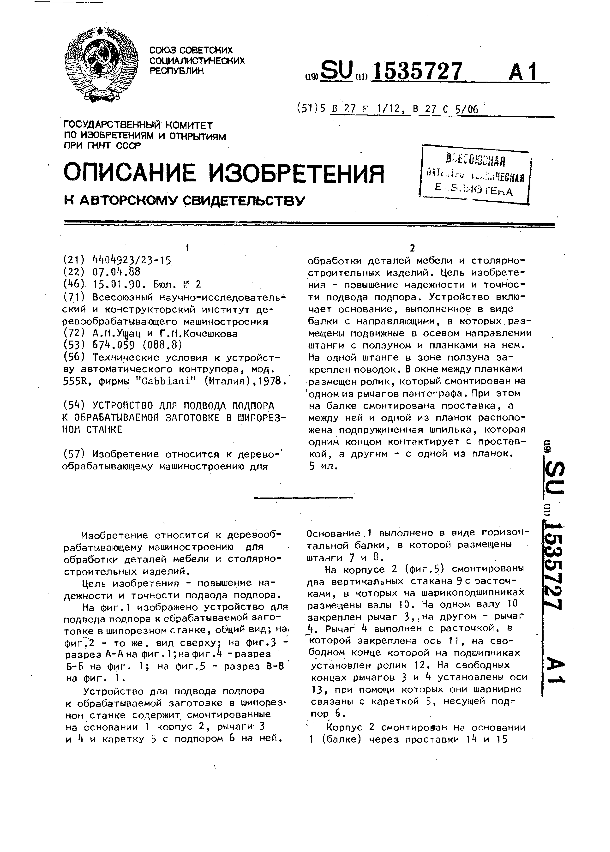 Устройство для подвода подпора к обрабатываемой заготовке в шипорезном станке / Ушац А. М., Кочешкова Г. М.; заявитель: Всесоюзный научно-исследовательский и конструкторский институт деревообрабатывающего машиностроения // Описания изобретений (ретрофонд) / Комитет по патентам и товарным знакам России. – М., 2003. – 1990, № 1. — (Патенты России). — Загл. с титул. экрана. — Поисковая система: MIMOSA GTI. — Систем. требования: Acrobat Reader. — Режим доступа: ftp://smolensklib.ru/bd/patent_ru/pt1535727.pdf. — <URL:ftp://smolensklib.ru/bd/patent_ru/pt1535727.pdf>.