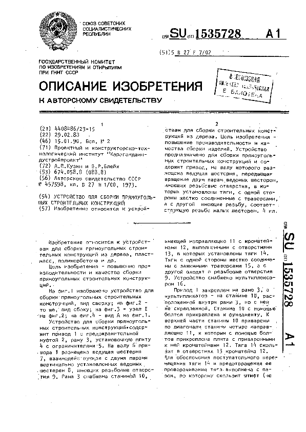 Устройство для сборки прямоугольных строительных конструкций / Кузин А. П., Блейх В. Р.; заявитель: Проектный и конструкторско-технологический институт "Карагандаиндустройпроект" // Описания изобретений (ретрофонд) / Комитет по патентам и товарным знакам России. – М., 2003. – 1990, № 1. — (Патенты России). — Загл. с титул. экрана. — Поисковая система: MIMOSA GTI. — Систем. требования: Acrobat Reader. — Режим доступа: ftp://smolensklib.ru/bd/patent_ru/pt1535728.pdf. — <URL:ftp://smolensklib.ru/bd/patent_ru/pt1535728.pdf>.