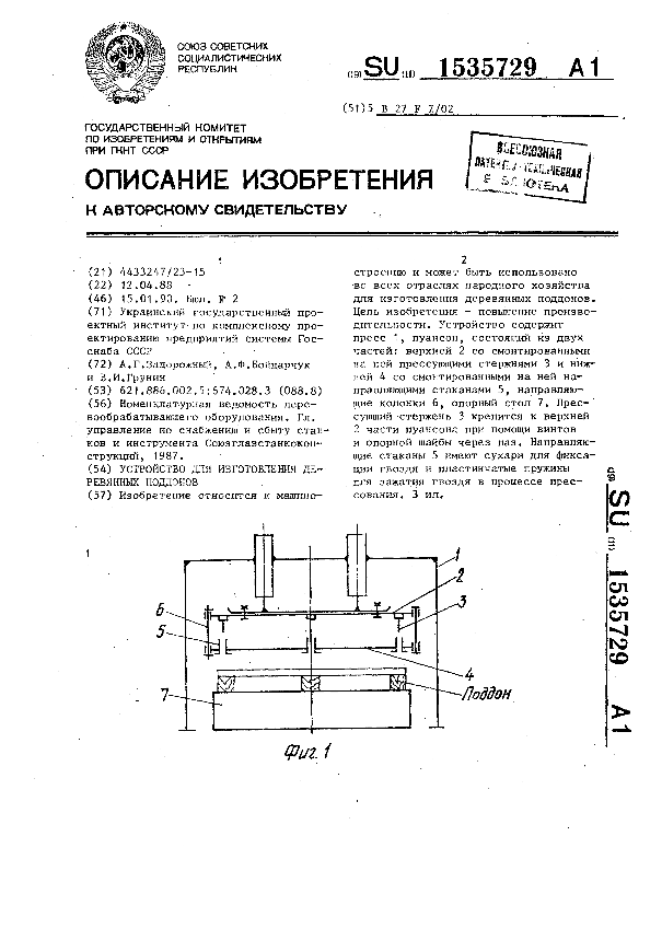 Устройство для изготовления деревянных поддонов / Задорожный А. Г., Бондарчук А. Ф., Грунин В. И.; заявитель: Украинский государственный проектный институт по комплексному проектированию предприятий системы Госснаба СССР // Описания изобретений (ретрофонд) / Комитет по патентам и товарным знакам России. – М., 2003. – 1990, № 1. — (Патенты России). — Загл. с титул. экрана. — Поисковая система: MIMOSA GTI. — Систем. требования: Acrobat Reader. — Режим доступа: ftp://smolensklib.ru/bd/patent_ru/pt1535729.pdf. — <URL:ftp://smolensklib.ru/bd/patent_ru/pt1535729.pdf>.