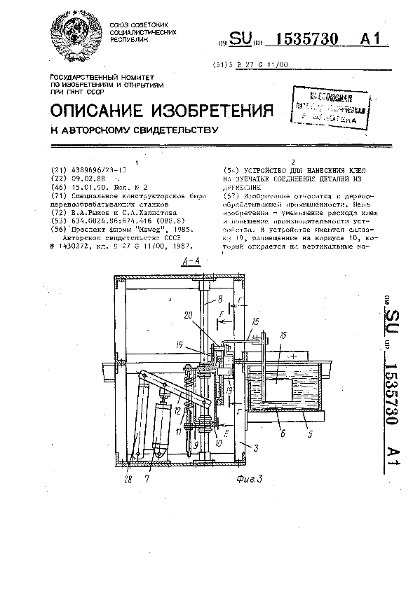 Устройство для нанесения клея на зубчатые соединения деталей из древесины / Рыжов В. А., Халистова С. А.; заявитель: Специальное конструкторское бюро деревообрабатывающих станков // Описания изобретений (ретрофонд) / Комитет по патентам и товарным знакам России. – М., 2003. – 1990, № 1. — (Патенты России). — Загл. с титул. экрана. — Поисковая система: MIMOSA GTI. — Систем. требования: Acrobat Reader. — Режим доступа: ftp://smolensklib.ru/bd/patent_ru/pt1535730.pdf. — <URL:ftp://smolensklib.ru/bd/patent_ru/pt1535730.pdf>.