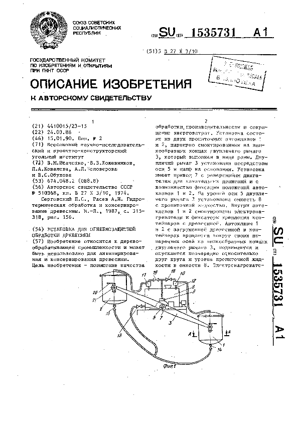 Устройство для огнебиозащитной обработки древесины / Исаченко В. М., Кожевников В. В., Ковалева Л. А. [и др.]; заявитель: Всесоюзный научно-исследовательский и проектно-конструкторский угольный институт // Описания изобретений (ретрофонд) / Комитет по патентам и товарным знакам России. – М., 2003. – 1990, № 1. — (Патенты России). — Загл. с титул. экрана. — Поисковая система: MIMOSA GTI. — Систем. требования: Acrobat Reader. — Режим доступа: ftp://smolensklib.ru/bd/patent_ru/pt1535731.pdf. — <URL:ftp://smolensklib.ru/bd/patent_ru/pt1535731.pdf>.