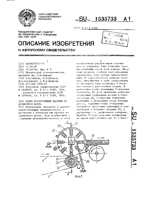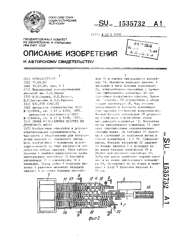 Линия изготовления палочек из древесного шпона / Сацура В. М., Валуев Н. И., Богданович Д. Г., Валуева Л. С.; заявитель: Белорусский технологический институт им. В. М. Кирова // Описания изобретений (ретрофонд) / Комитет по патентам и товарным знакам России. – М., 2003. – 1990, № 1. — (Патенты России). — Загл. с титул. экрана. — Поисковая система: MIMOSA GTI. — Систем. требования: Acrobat Reader. — Режим доступа: ftp://smolensklib.ru/bd/patent_ru/pt1535732.pdf. — <URL:ftp://smolensklib.ru/bd/patent_ru/pt1535732.pdf>.